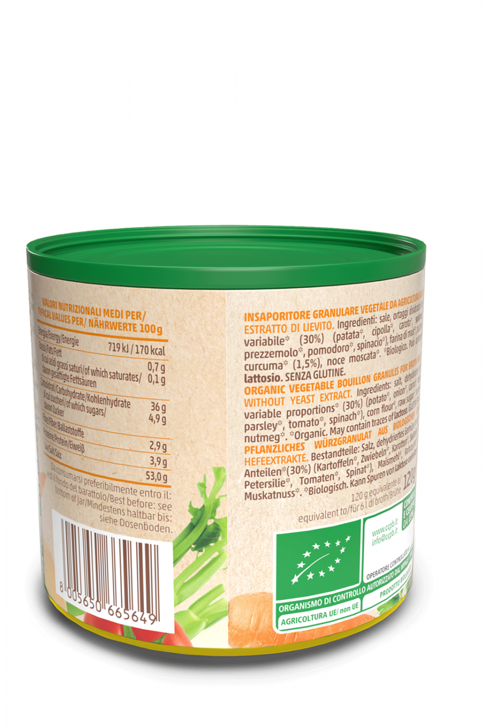 Features: with accurately selected ingredients from organic farming, it contains 8 types of vegetables: potato, onion, celery, carrot, basil, tomato, spinach and parsley. Being granular, it is perfect to be dosed as you prefer and balance the taste of your dishes.