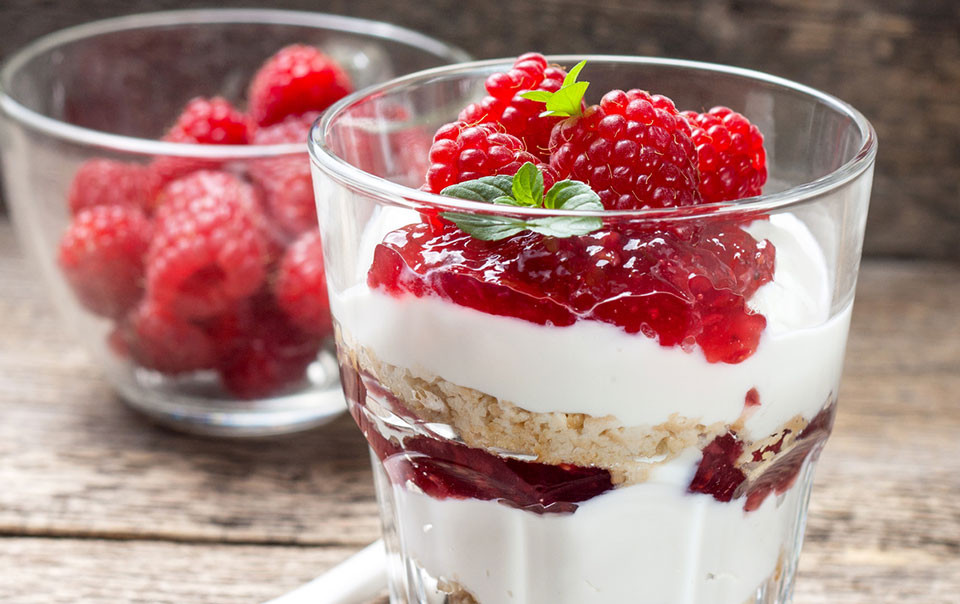 In un contenitore dai bordi alti versare 250 ml di latte, aggiungere 200 g di formaggio spalmabile ed il preparato per la crema. Montare con lo sbattitore elettrico alla massima velocità per 4 minuti. Lasciare raffreddare in frigorifero per almeno 1/2 ora. Mettere la crema in una tasca da pasticcere con bocchetta zigrinata. Preparare i bicchierini facendo uno strato di frollini, uno strato di crema, qualche goccia di salsa ai frutti di bosco e ripetendo di nuovo gli strati. Alla fine decorare con un lampone.
