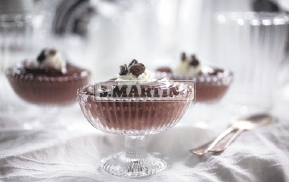 Distribuire nei bicchierini e cospargere con le briciole al cacao.