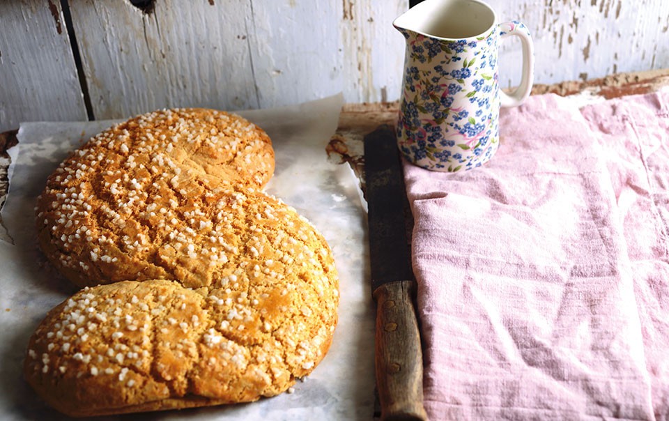 Spennellare la superficie con albume d’uovo leggermente sbattuto e guarnire con granella di zucchero.