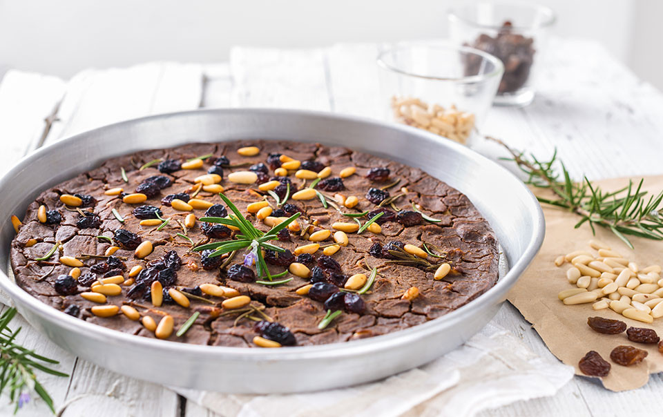 Decorare con l’uvetta e i pinoli tenuti da parte in precedenza, aggiungendo anche qualche aghetto di rosmarino.