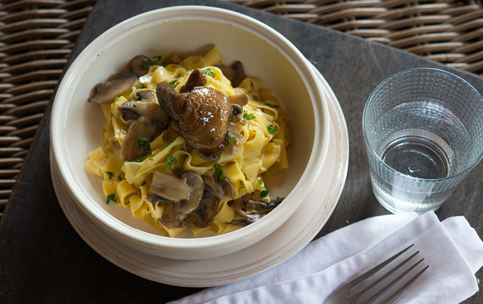 In una padella versare l'olio e lo scalogno tagliato finemente, aggiungere i funghi e un dado. Cuocere per circa 15 minuti.