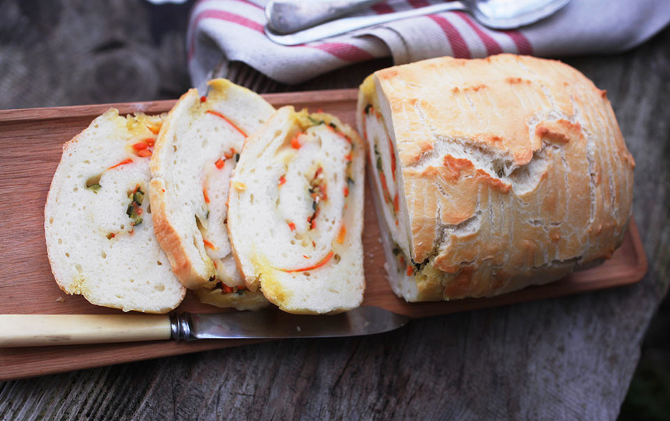 Stendere con il mattarello l’impasto formando un rettangolo con spessore di mezzo centimetro, disporvi sopra le verdure e arrotolare il tutto su se stesso.